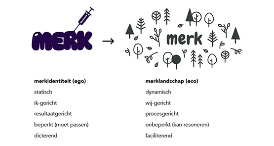 In de nieuwe wereld heeft het merk meer bewegingsruimte nodig. Het beperkende jasje van de merk-identiteit wordt te klein voor het organisch groeiende merk. Ook wordt er een andere interactie gevraagd tussen het merk en de klant. De merk-klant verhouding wordt meer en meer een mens-mens relatie.